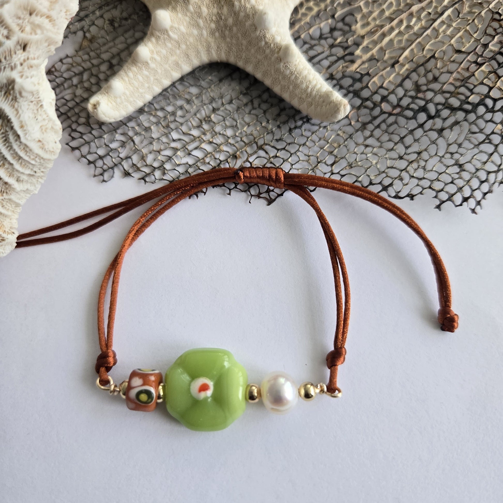 Perla de Monte es una pulsera que honra la belleza silvestre de la tierra. Hecha a mano con hilo ajustable y detalles en alambre, su diseño combina una delicada flor de cristal con una perla que evoca la pureza escondida en la naturaleza. Los tonos terrosos —rojo, amarillo, verde y marrón— se entrelazan como caminos en el bosque, recordándonos nuestras raíces y el poder suave de lo natural. Una joya ligera, versátil y llena de intención.