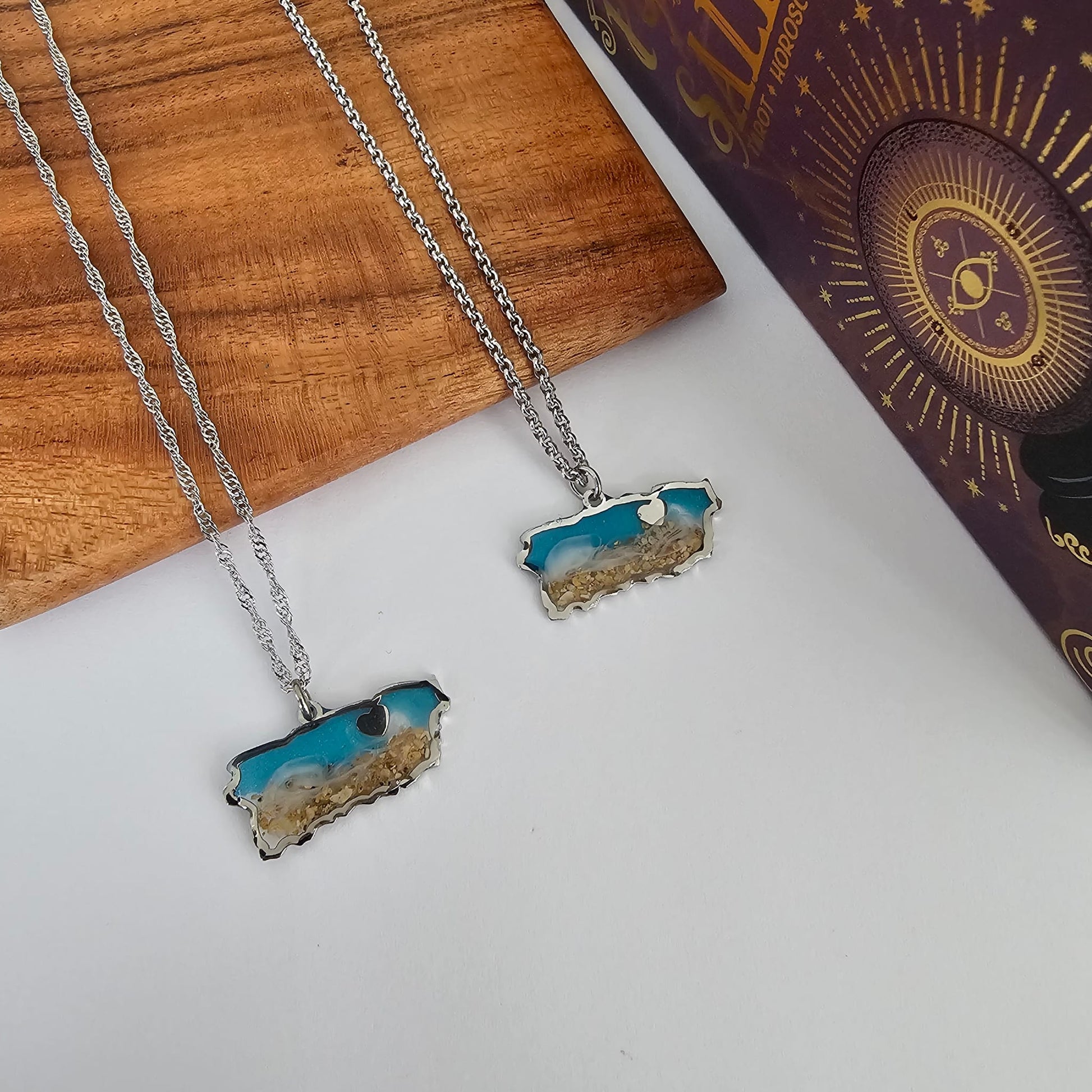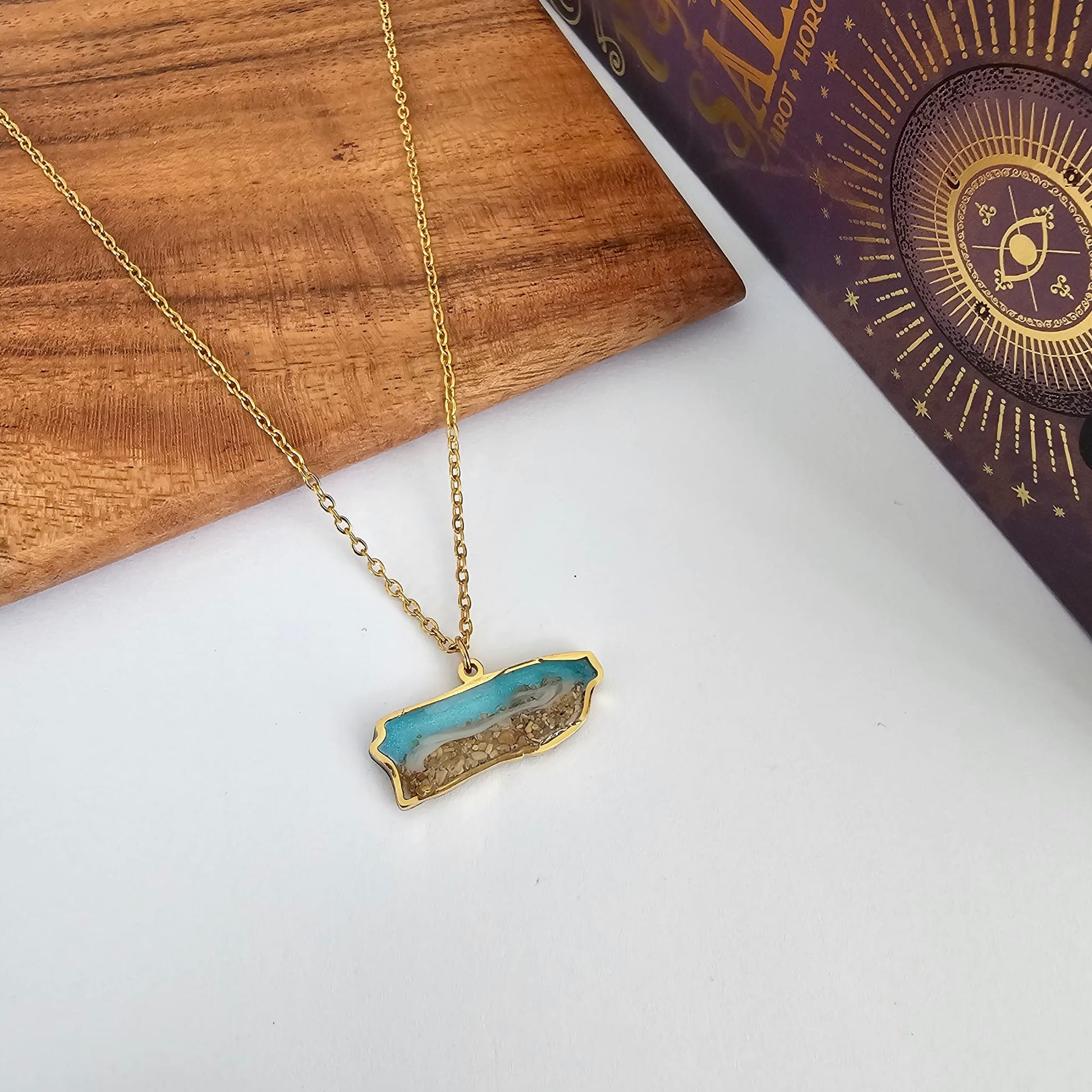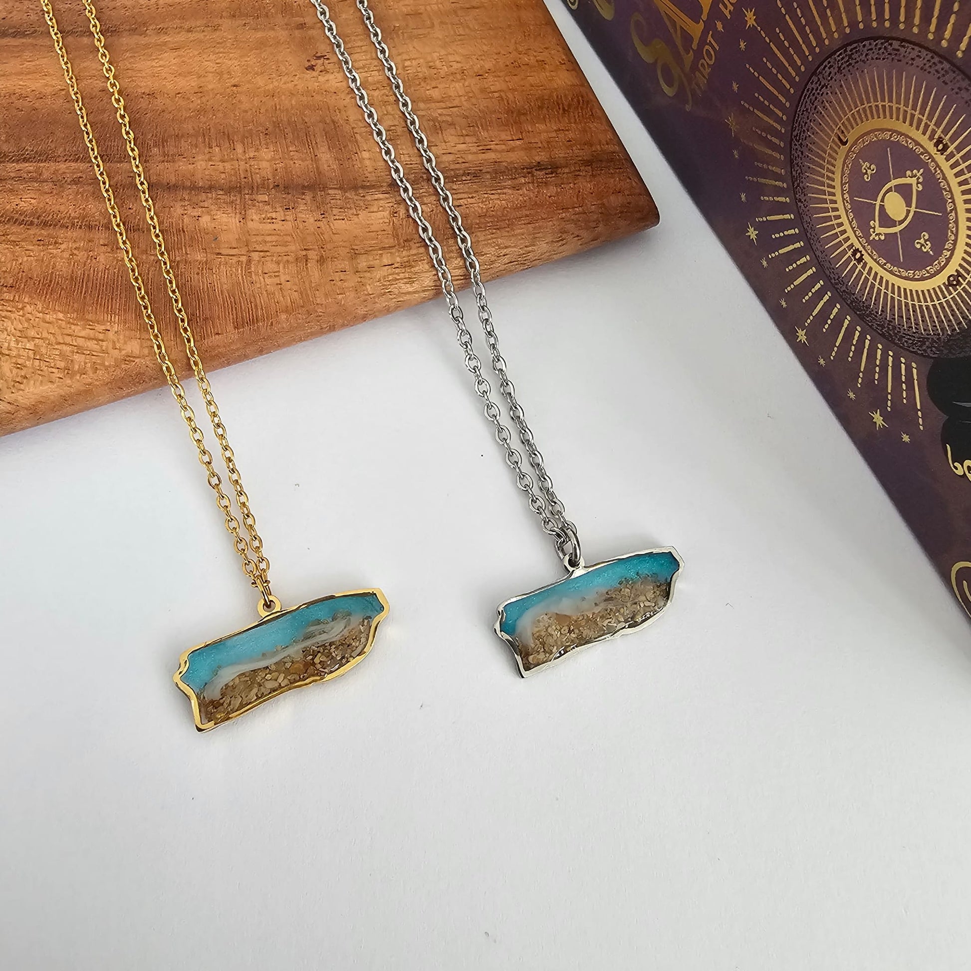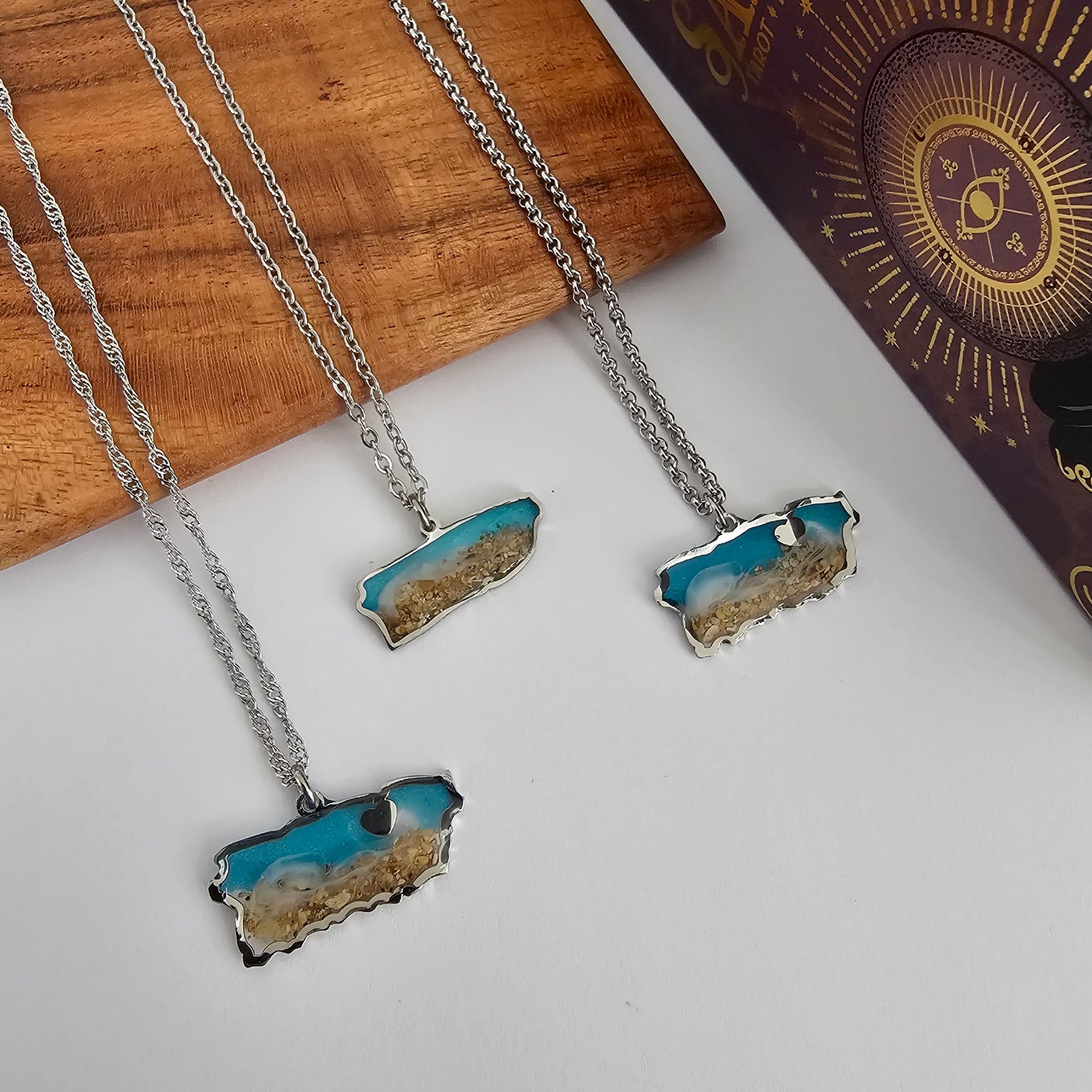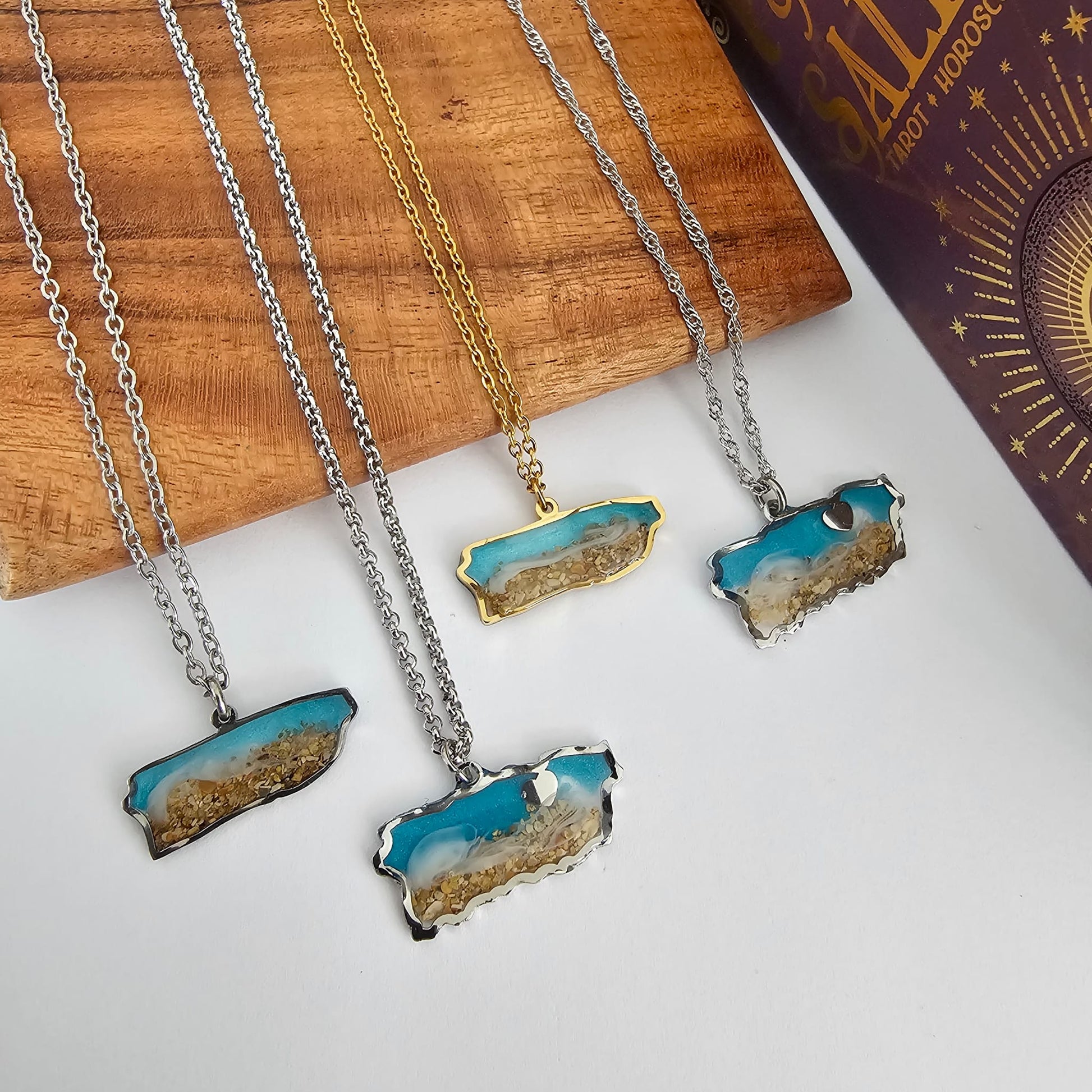 Luce un pedacito de playa con Azul de Aviones, una cadena hecha con arena real de Playa Aviones y resina que simula la costa boricua. Brilla como el mar bajo el sol y conecta con tu amor por la isla.
